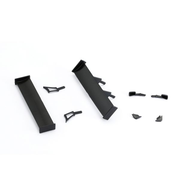 INCLUDES FULL REAR WING, PARTIAL REAR WING, REAR WING SUPPORT, LEFT AND RIGHT MIRRORS, LEFT AND RIGHT FINS